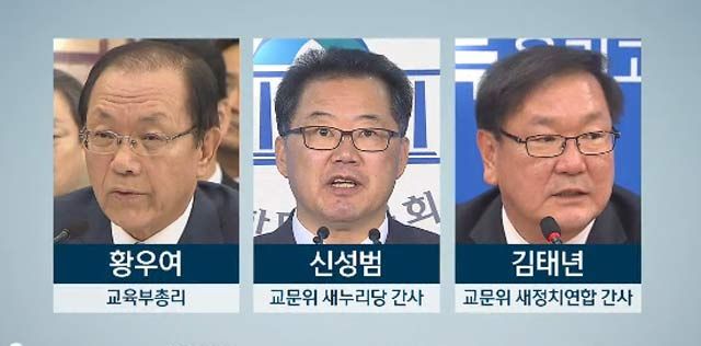 김재원 새누리당 원내수석부대표는 합의 사실이 알려지자, 황급히 이완구 원내대표실을 찾아 대책을 논의했습니다. 이어 합의를 인정할 수 없다는 내용의 회견을 했습니다. 회견 뒤에도 "황우여 장관의 월권"이라는 표현까지 써가며 지도부를 배제한 3자 합의에 강하게 반발했습니다. 혼란의 단초를 제공한 신성범 교문위 여당 간사도 곧바로 기자회견을 열어 책임을 지고 교문위 간사직을 사퇴했습니다.