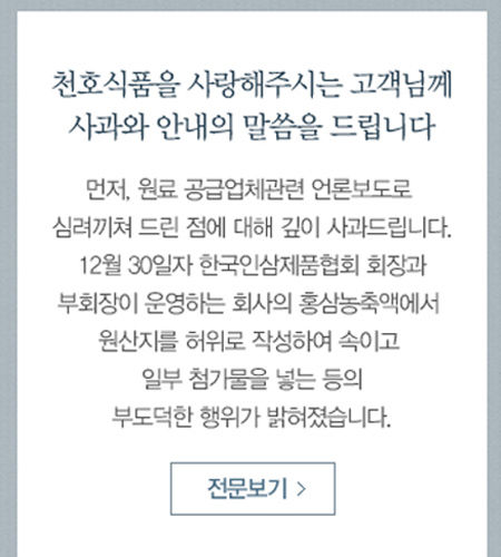 천호식품은 자사 홈페이지에 "한국인삼제품협회 회장과 부회장이 운영하는 회사의 홍삼 농축액에서 원산지를 허위로 작성해 속이고 일부 첨가물을 넣는 등의 부도덕한 행위가 밝혀졌다"며 사과문을 게재했습니다.