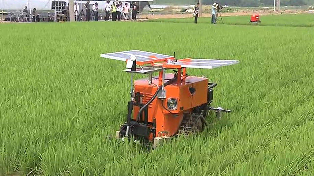 요즘 농촌에서는 고령화로 일손이 모자란 데다 농약을 쓰지 않는 친환경 벼 재배지역이 많아지면서 잡초가 골치인 데 슈퍼 일꾼이 등장했습니다. 로봇 일꾼인데요, 하루 종일 일을 해도 끄떡없고 제초율도 80% 가 넘는다고 합니다.
