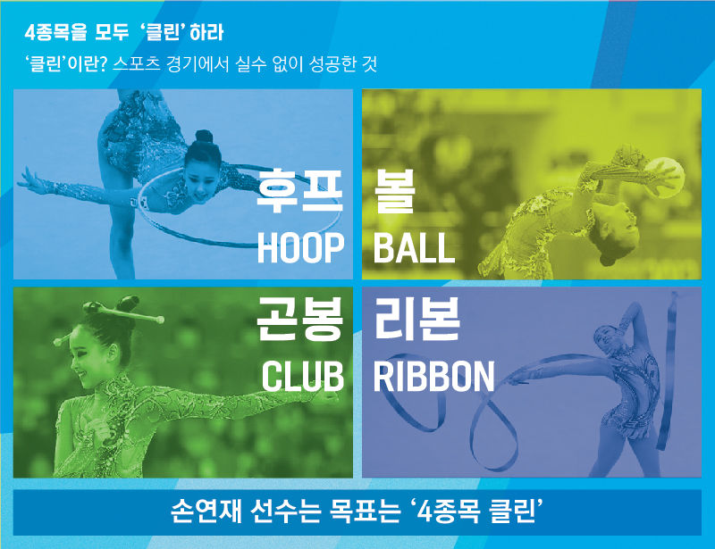 올림픽 리듬체조 4종목은 후프, 볼, 곤봉, 리본입니다. 손연재 선수는 이번 올림픽에서 4종목 ‘클린’을 목표로 하고 있죠. 선수들은 4종목을 모두 해내야 하기 때문에 기초 체력과 기술, 강한 정신력으로 무장해야 합니다.