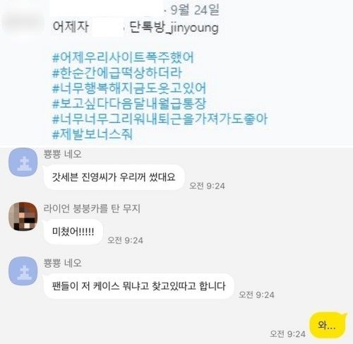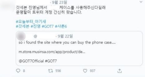 업체 측은 갑작스러운 매출 증가에 당황한 것도 잠시, 휴대전화 케이스를 많이 구매해준 팬들에게 고마움을 전하기 위해 SNS 계정을 만들어 소통하기 시작했습니다. 업체 관계자는 "진영 님 덕분에 우리 회사 기쁨의 댄스 중. 이 모든 글로리를 월드 클라스 탑 아이돌 진영 님과 최고의 팬클럽 '아가새'님들에게 돌린다"며 기쁜 마음을 드러냈습니다.