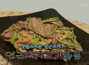 재료 : 연근, 식초, 돼지고기, 생강즙, 후추, 간장, 설탕, 마늘, 물엿, 부추, 통깨, 참기름