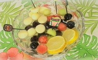 4. 차게 식은 포도주 시럽을 그릇에 넣고 과일을 넣어서 레몬으로 장식한다.