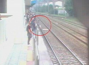이를 본 승객 가운데 한 명이 곧바로 뛰어내려 노인을 옆 선로로 밀어내고, 얼마 안 있어 열차가 아슬아슬하게 이들이 함께 있던 자리를 지나 들어옵니다.