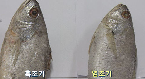 화면 왼쪽의 냉동 흑조기가 소금물로 탈색하면 일반인이 쉽게 구분할 수 없는 오른쪽 염조기로 바뀝니다.