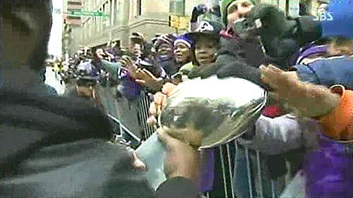 슈퍼볼 우승팀 볼티모어 선수단이 퍼레이드를 펼쳤습니다. 선수들도 평생 한 번 만질까 말까 한 빈스롬바르디 트로피를 팬들도 만져보게 해줬네요. 스포츠 뉴스였습니다.