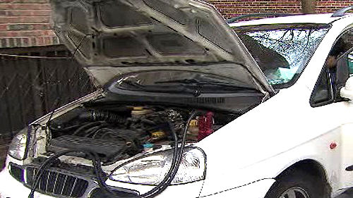 펄펄 끓는 물을 차량 기화기에 붓습니다.