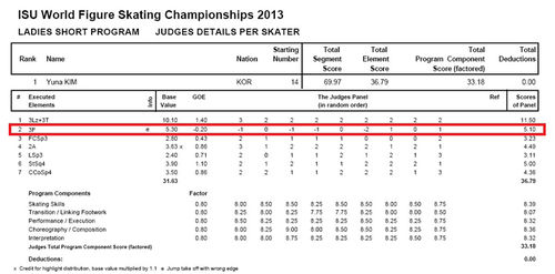 ▲ 김연아 쇼트프로그램 성적표. 두번 째 점프인 트리플 플립에서 '롱에지(e)' 판정을 받아 0.2점 감점. (캡쳐화면=ISU 공식사이트)