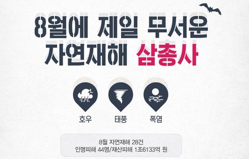 8월에는 ‘호우, 태풍, 폭염’을 조심해야 한다. 소방방재청에 의하면 최근 10년간 8월에 일어난 자연재해는 28건으로 인명피해가 44명, 재산피해는 1조 6133억 원에 이르는 것으로 나타났다.