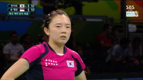 리우올림픽 탁구 여자 단식 4라운드 경기에서 전지희 선수가 싱가포르의 맹유 유 선수를 상대로 경기를 펼치고 있습니다. (SBS 뉴미디어부)