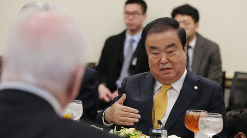 방미 중인 문 의장은 이날 워싱턴DC 인근에서 열린 특파원 간담회에서 "내가 한 말은 평소 지론이며 10년 전부터 얘기해온 것"이라며 "근본적 해법에 관해서는 지금도 그렇게 생각한다"라고 말했습니다.