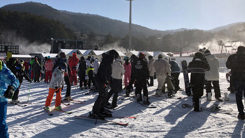 시설 내 실내 음식점 띄어 앉기나 테이블 의자 수거 등 나름의 대책을 강구한 모습이었지만, 시즌권 발급받는 곳이나 리프트 탑승장 앞에 길게 줄지어 선 사람들은 대부분 간격이 1m도 채 되지 않을 만큼 바짝 붙어 서 있었습니다.