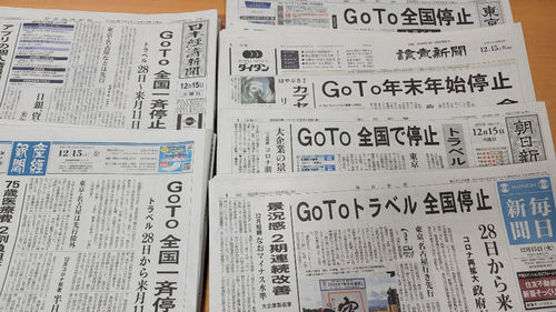 지금까지 '여행 촉진책이 감염 확산의 원인이라는 과학적 증거가 없다'는 말을 반복하며 '과학적 증거'에 밑줄을 그어 온 스가 정권에게 완전히 뒤집혀 버린 지지율 수치야말로 움직일 수 없는 '과학적 증거'로 받아들여진 것 같습니다. 지난 주말 스가 총리는 주변 측근들에게 연말연시에 여행 촉진책을 중단하면 어떤 여파가 생기는지를 물으며 생각을 정리했다고 합니다.