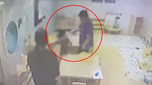 장애아동의 머리채를 잡고 내동댕이치다가 커다란 쿠션으로 내리칩니다.