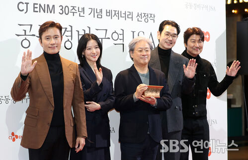 [SBS Entertainment News | Baik Seung-Chul] Actors Lee Byung-hun (from left), Lee Young-ae, director Park Chan-wook, Kim Tae-woo, and Song Kang-ho attended a special screening event for the film 'Joint Security Area (JSA)' at CGV Yongsan I-Park Mall in Yongsan, Seoul, on the afternoon of the 4th, where they posed for photos.