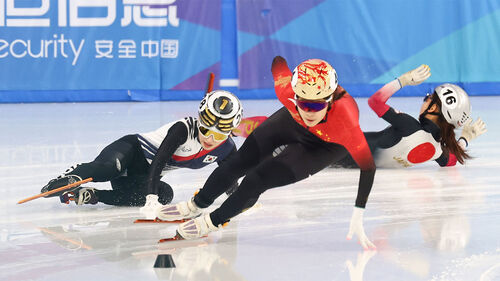 ▲ 9일 중국 하얼빈 헤이룽장 빙상훈련센터 다목적홀에서 열린 하얼빈 동계아시안게임 쇼트트랙 여자 1000m 준준결승에서 김길리가 넘어지고 있다.