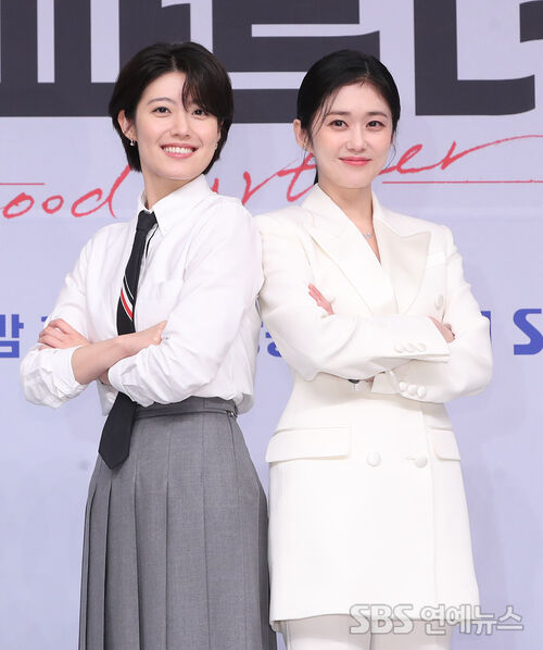 Actors Nam Ji-hyun (left) and Jang Nara hit the photo line at SBS in Mokdong, Seoul, during the press conference for the new Friday-Saturday drama 'Good Partner' on July 10.