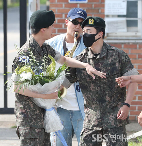 On the morning of June 12, freshly discharged after completing his mandatory service, BTS’s JIN (left) shared a warm greeting with bandmate JIMIN outside the Army’s 5th Infantry Division Recruit Training Center in Yeoncheon, Gyeonggi Province.