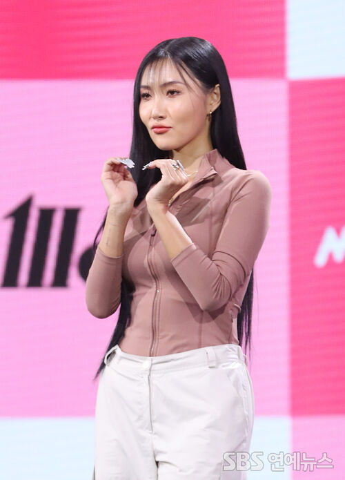 Hwasa of MAMAMOO hit the photo line at the media showcase celebrating the group’s 12th mini-album, MIC ON, at Yes24 Live Hall in Seoul’s Gwangjin District on Oct. 11, 2022. Even a simple finger-heart came with her trademark swagger.