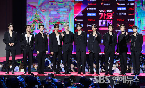 THE BOYZ hit the red carpet at the 2023 SBS Music Awards at Inspire Arena in Incheon on Dec. 25, striking confident poses in sleek, all-black suits during the photo call.