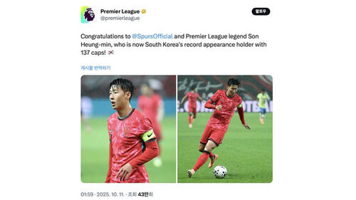 EPL 사무국은 11일(한국시간) SNS에 "137번째 A매치에 나서며 한국 남자 대표팀 최다 출전 기록을 경신한 토트넘 홋스퍼와 EPL의 레전드 손흥민에게 축하를 보낸다"는 게시물을 올렸습니다.