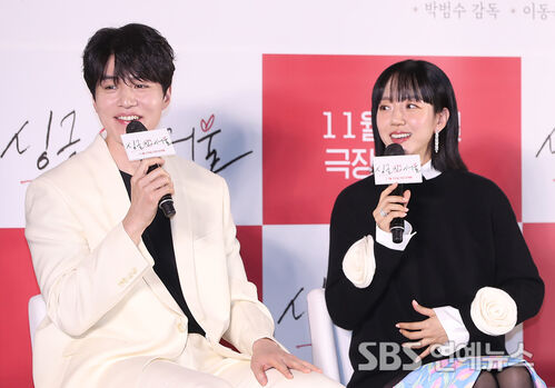 Actors Lee Dongwook (left) and Lim Soojung took the stage at Lotte Cinema Konkuk University in Seoul on Nov. 3 for the “Single in Seoul” production briefing, sharing a lighthearted onstage chat about the film.