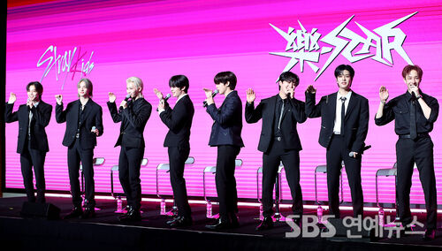 Stray Kids showcased their smooth “wave” ― the group’s signature point move ― during a Nov. 10, 2023 press conference at the Conrad Seoul celebrating the release of their mini-album ROCK-STAR (樂-STAR).
