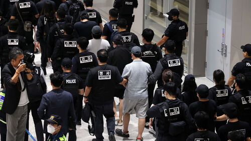 ▲ 캄보디아 온라인 사기에 가담해 구금된 한국인들이 18일 오전 인천국제공항 제2터미널을 통해 송환되고 있다.