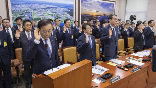 ▲ 김윤덕 국토교통부 장관이 29일 국회 국토교통위원회에서 열린 2025년도 종합 국정감사에 출석해 증인을 대표해 선서하고 있다.