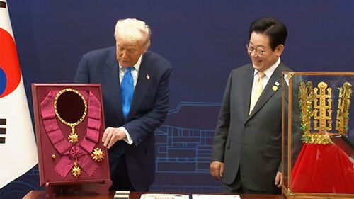 이재명 대통령은 국빈을 최고 수준으로 예우한다는 뜻에 따라 우리나라 최고 훈장인 무궁화 대훈장을 트럼프 대통령에게 수여했습니다. 미국 대통령에게 무궁화 대훈장을 수여하는 건 이번이 사상 처음입니다. 이 대통령은 또, 신라의 정신이 담긴 신라 금관모형도 선물했습니다.