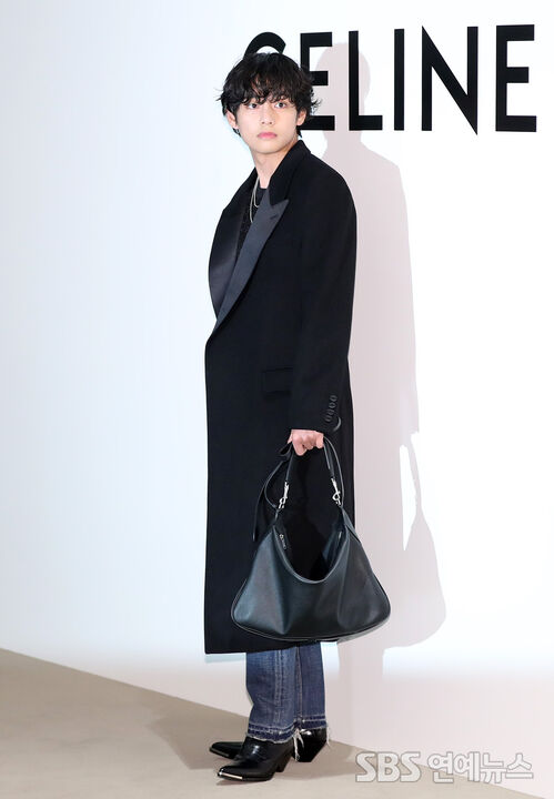 V of BTS struck a pose at Celine’s photocall at The Hyundai Seoul in Yeongdeungpo, Seoul, on the evening of March 30, turning heads in a sleek black long coat.