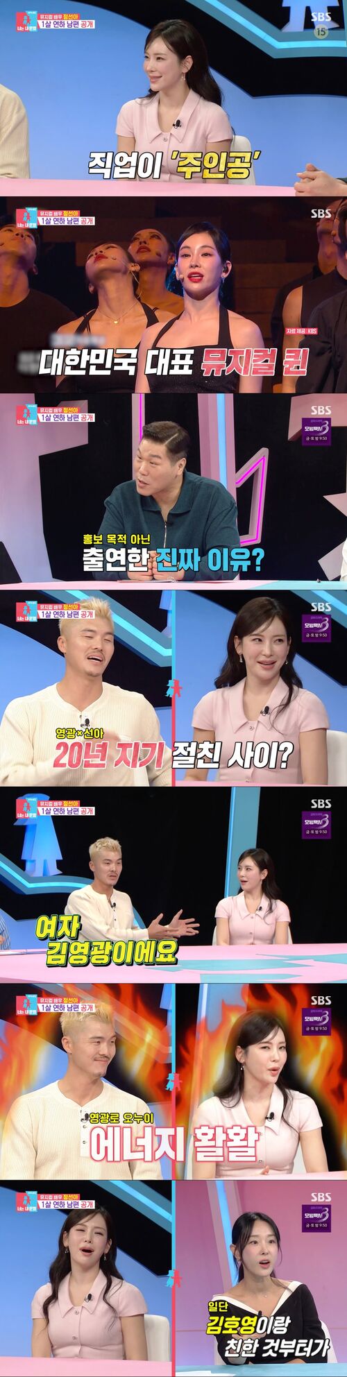 이에 김영광은 "여자 김영광이다. 성격이 똑같다"라며 친근감을 드러냈다. 그러자 정선아는 "사실 이번에 남편이랑 같이 동상이몽을 시청했다. 영광 오빠를 보면서 거울을 보는 거 같고 우리 집을 보는 거 같았다"라며 김영광처럼 에너지가 넘친다고 말해 눈길을 끌었다.