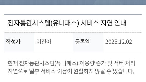 관세청은 2일 홈페이지에 안내문을 올려 "현재 유니패스 이용량 증가 및 서버 처리 지연으로 일부 서비스 이용이 원활하지 않을 수 있다"고 밝혔습니다.