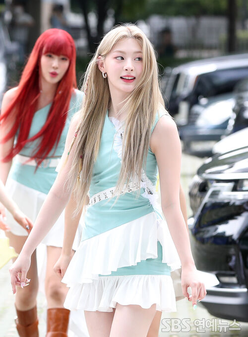 Seeun of STAYC arrives at SBS in Mokdong, Seoul, for an appearance on SBS PowerFM's Cultwo Show, serving major blonde Barbie vibes.
