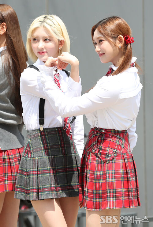 IVE’s GAEUL (left) and LEESEO flash picture-perfect heart hands as they arrive at JTBC’s Ilsan studios in Goyang, just outside Seoul, on Aug. 18, 2022, for a variety show taping.