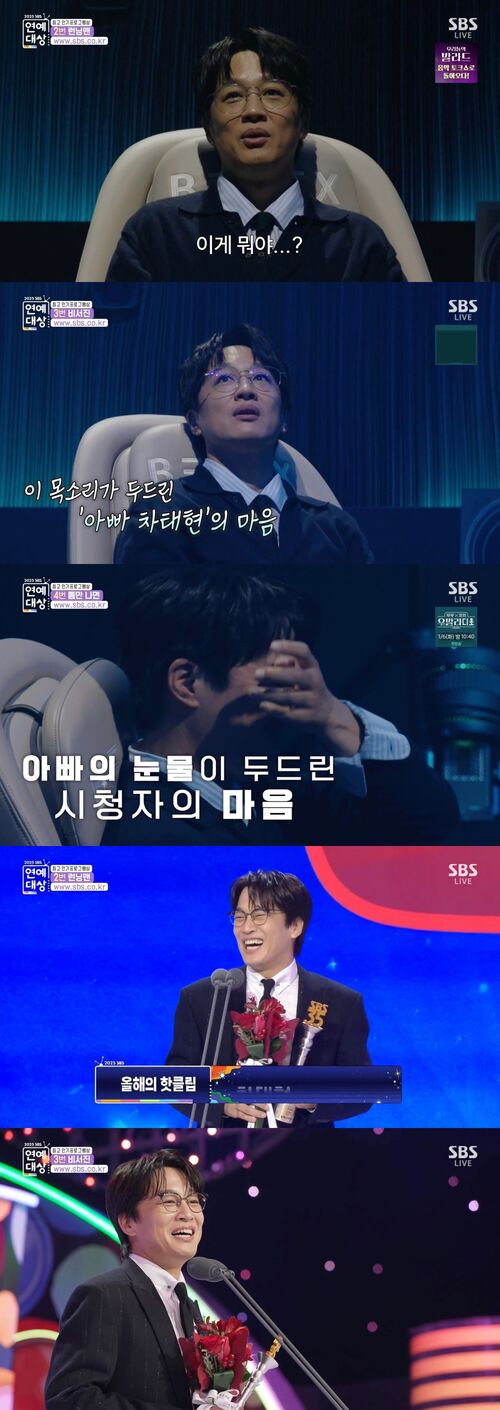 특히 이예지의 목소리에 흘린 그의 뜨거운 눈물이 많은 이들의 공감을 자아냈던 것. 수상자로 이름이 호명된 차태현은 "이게 뭡니까? 이걸로 퉁인가? 끝났어요 저? 탁재훈 씨랑 비슷한 상황입니까?"라며 크게 웃었다.