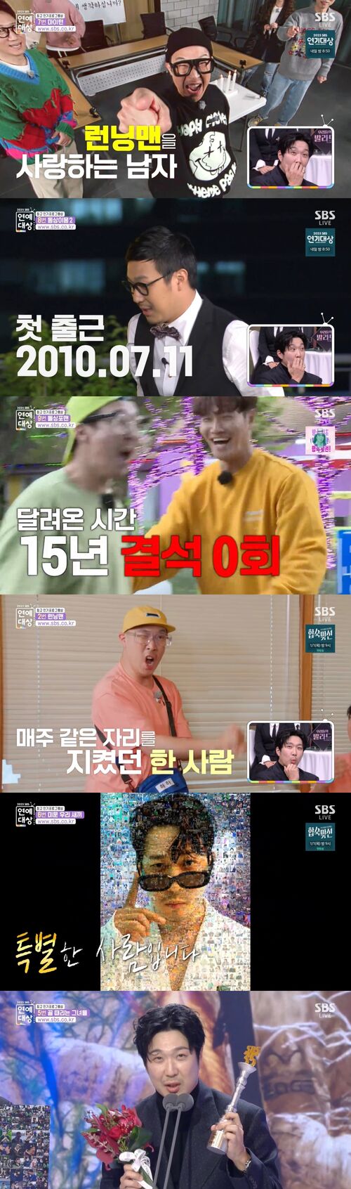 비가 오나 눈이 오나 매주 같은 자리를 지켰던 하하는 런닝맨과 함께 사랑을 이루고 가족도 이루며 어느새 하포티로 성장한 것. 이에 SBS 연예대상은 15년간 우리의 일요일을 웃음으로 채워준 특별한 사람 하하에게 특별상을 수여했다.