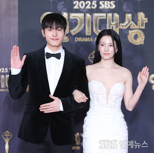 Actors Lee Chang-min (left) and Han Dong-hee strike a playful “praying mantis” pose on the photo wall at the 2025 SBS Drama Awards, held at SBS Prism Tower in Mapo-gu, Seoul, on Dec. 31.