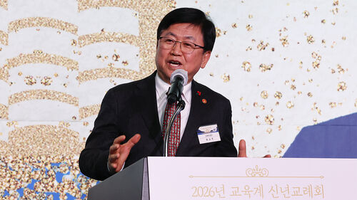 ▲ 최교진 교육부 장관이 지난 7일 서울 여의도 FKI 타워에서 열린 '2026 교육계 신년교례회에서 축사하고 있다.
