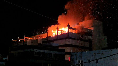 한 건물 옥상에서 시뻘건 불길과 함께 희뿌연 연기가 하늘로 솟구칩니다.