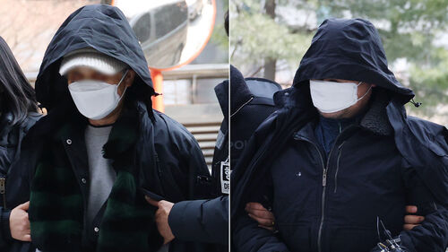 A 씨와 B 씨는 수갑이 채워진 두 손을 가리개로 덮은 모습이었으며 모자와 마스크를 써 얼굴 노출을 피했습니다.