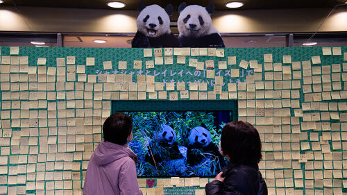 ▲ 지난 22일 일본 시민들이 자이언트판다 '샤오샤오'와 '레이레이'에게 보내는 작별 메시지를 살펴보고 있다.