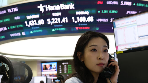 ▲ 코스피가 하락 출발한 뒤 장 초반 5,220대로 올라서며 강보합세를 보이고 있는 30일 서울 하나은행 본점 딜링룸에서 딜러들이 업무를 보고 있다