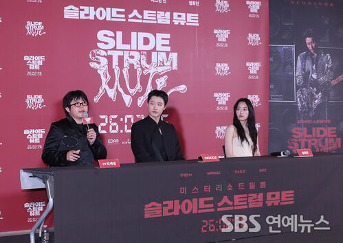 Director Park Se-young (from left), WOODZ, and Jung Hoe Ryn take questions during the press Q&A for the film 'Slide Strum Mute' at CGV Yongsan I'Park Mall in Yongsan-gu, Seoul, on the afternoon of the 20th.