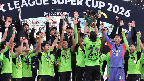 ▲ 21일 전북 전주월드컵경기장에서 열린 '쿠팡플레이 K리그 슈퍼컵 2026' 전북 현대와 대전 하나 시티즌 경기에서 우승한 전북 현대. 주장 김태환이 슈퍼컵을 들며 환호하고 있다.