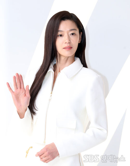 Gianna Jun strikes a pose at the Merz Aesthetics brand photo wall event held on Bukchon-ro in Jongno-gu, Seoul, on the morning of the 27th.