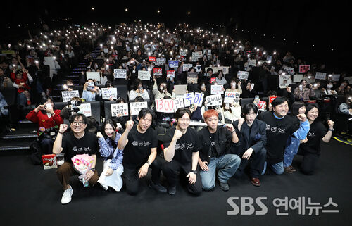 From left, director Jang Hang-jun, actors Jeon Mi-do, Yoo Hae-jin, Yoo Ji-tae, Park Ji-hoon, Kim Min, Lee Jun-hyuk, Park Ji-yoon, and Kim Su-jin attend a box-office appreciation stage greeting for the film 'The King's Warden' at Megabox COEX in Gangnam-gu, Seoul, on the afternoon of the 17th, and take a commemorative photo with the audience.