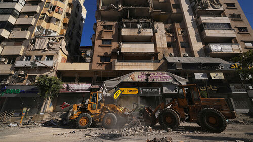 ▲ 지난 17일 레바논 베이루트 남부 교외 다히예에서 이스라엘 공습으로 손상된 건물 잔해를 불도저가 치우고 있다.