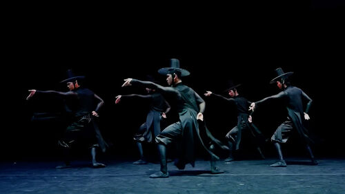 휘날리는 도포 자락, 갓을 쓴 무용수들의 움직임이 역동적이면서도 우아합니다.