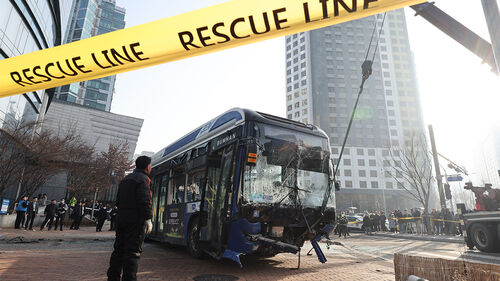 ▲ 지난 1월 16일 오후 서울 서대문역 사거리에서 인도로 돌진해 건물과 충돌한 버스가 견인되고 있다.